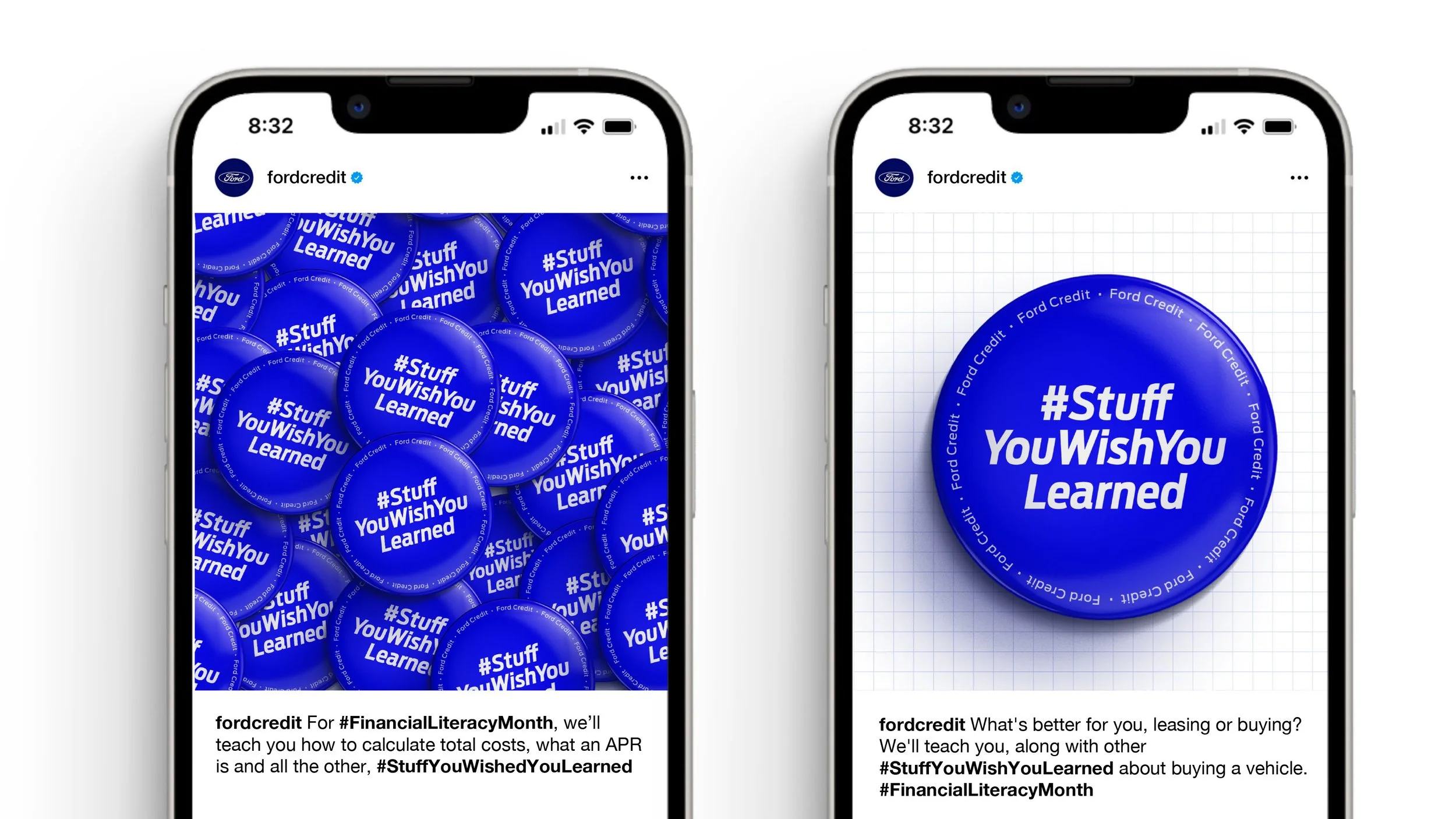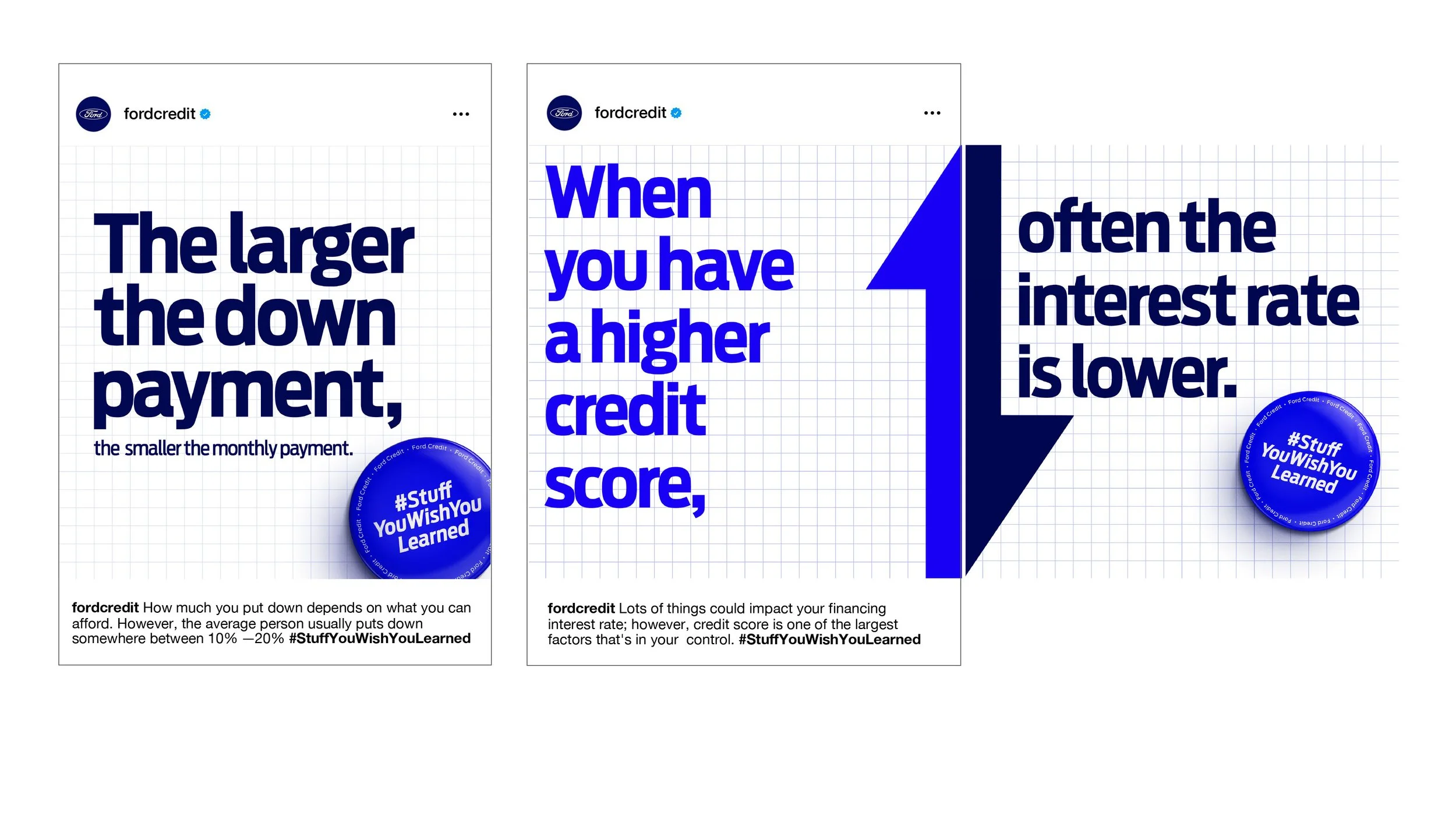 Ford Credit Social Media— In an effort to bridge the financial literacy gap amongst Gen Z, Millenials and new car buyers, Ford Credit launched its social media during finical literacy month. Gen Z and Millennials are beginning to realize they are completely unprepared for adult world. While we all may know the mitochondria is the powerhouse of the cell… school didn’t teach us all how to calculate an APR, apply for a loan or compare interest rates. Ford Credit aims to educate those who may have missed out #StuffYouWishYouLearn