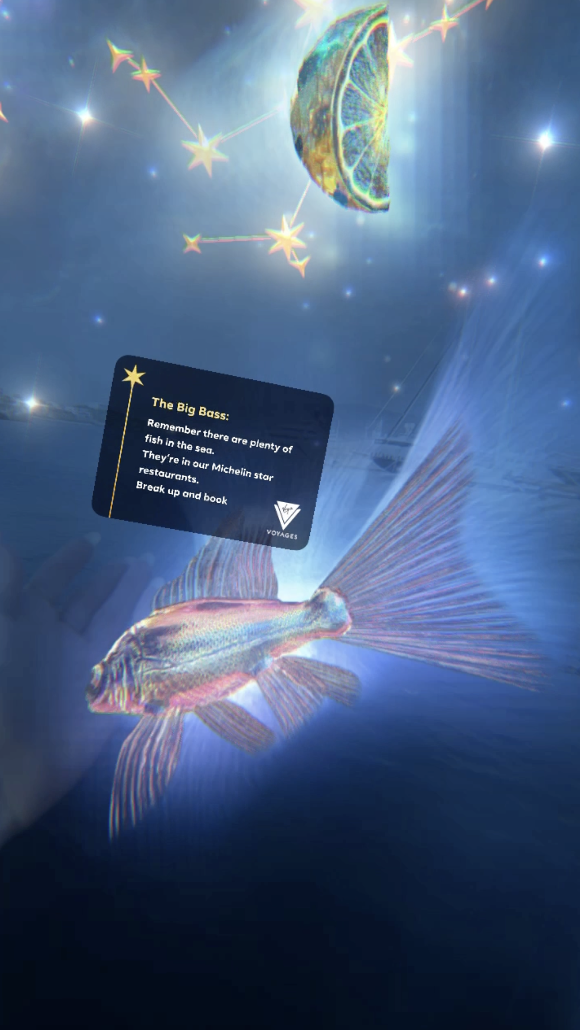 Star Sign Seeker AR Filter — Virgin Voyages is a cruise line that offers adult-only cruises to the Caribbean, Mediterranean, and Europe. This year it charts a new course in collaboration with Meta Spark AR Creators. For centuries sailors have looked to the stars for signs and as way to guide them on voyages, so we re-imagined celestial navigation for the modern era. The AR filter transforms the stars above into constellations reflecting Virgin Voyages brand element and amenities like mermaids, exotic drinks, hammocks, octopuses, and more. This immersive experience allows travelers to interact with these virtual starry creations. Seamlessly blending tradition and technology, this celestial voyage beckons all adventurers with a compelling call to action: This is your sign to book.